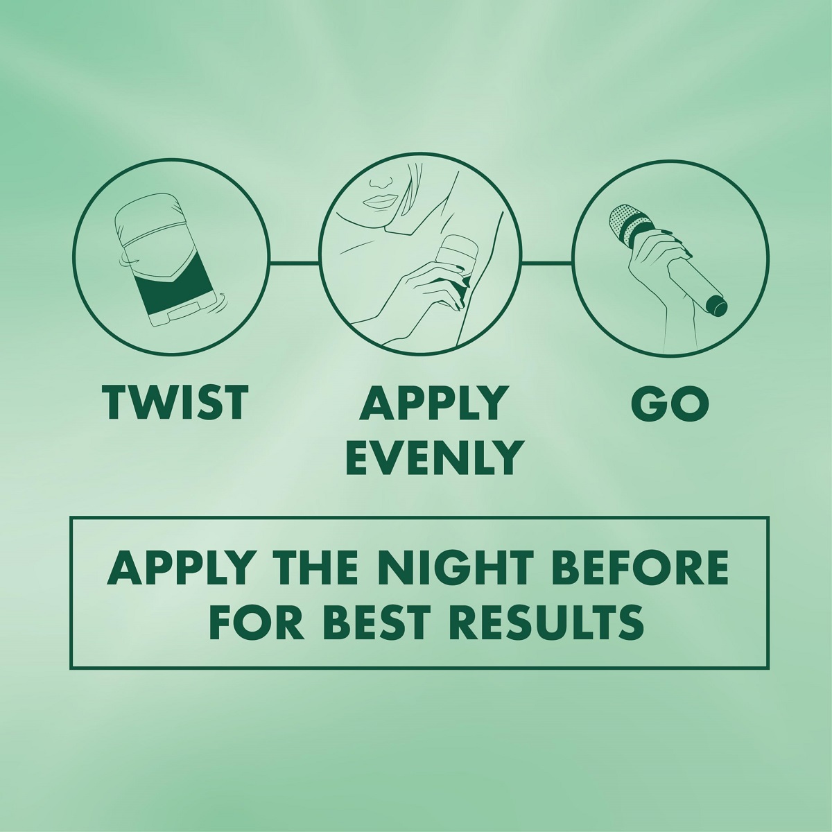 - برای حداکثر محافظت، توصیه میشود محصول را شب قبل از خواب روی زیر بغل تمیز و خشک بمالید. این کار به فرمول اجازه میدهد تا در طول شب فعال شده و محافظت طولانیمدتتری ارائه دهد.