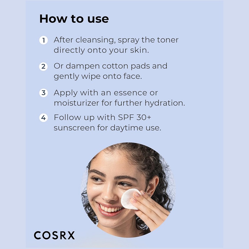 پس از پاکسازی، تونر را روی یک پد پنبه ای اسپری کنید و به آرامی صورت خود را با آن پاک کنید و از استتفاده در ناحیه چشم و دهان خودداری کنید. برای استفاده در طول روز، از یک ضد آفتاب با طیف وسیع با SPF 30 یا بیشتر استفاده کنید.