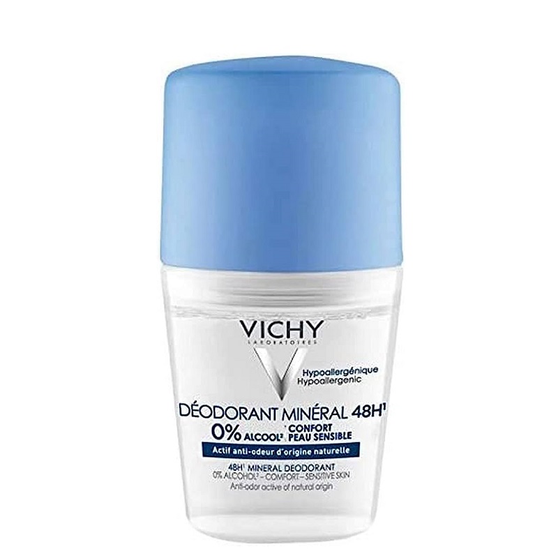 رول دئودورانت مینرال بدون آلومینیوم ویشی، حاوی مواد معدنی است و با از بین بردن باکتری های روی پوست مانع ایجاد بوی نامطبوع میشود. این محصول دارای 48 ساعت ماندگاری است. این محصول دارای ترکیبی از گلوکونات روی و 15 ماده معدنی است که از چشمه های آب معدنی ویشی بدست آمده و خاصیت ضد بو دارد. همچنین در فرمولاسیون آن از نمک آلومینیم، الکل و پارابن استفاده نشده است و فرمول ضدحساسیت آن که حاوی پروویتامین B5 است از نظر بالینی و پوستی مورد تایید قرار گرفته است.