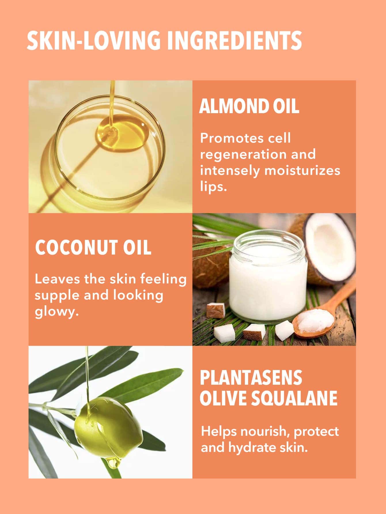 به لطف استفاده از مواد مفیدی مانند روغن بادام شیرین، روغن نارگیل و Plantasens Olive Squalane که باعث تسکین و بهبود ظاهر لبهای شما میشود، حس خوبی را تجربه خواهید کرد.