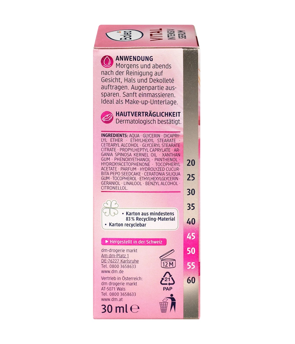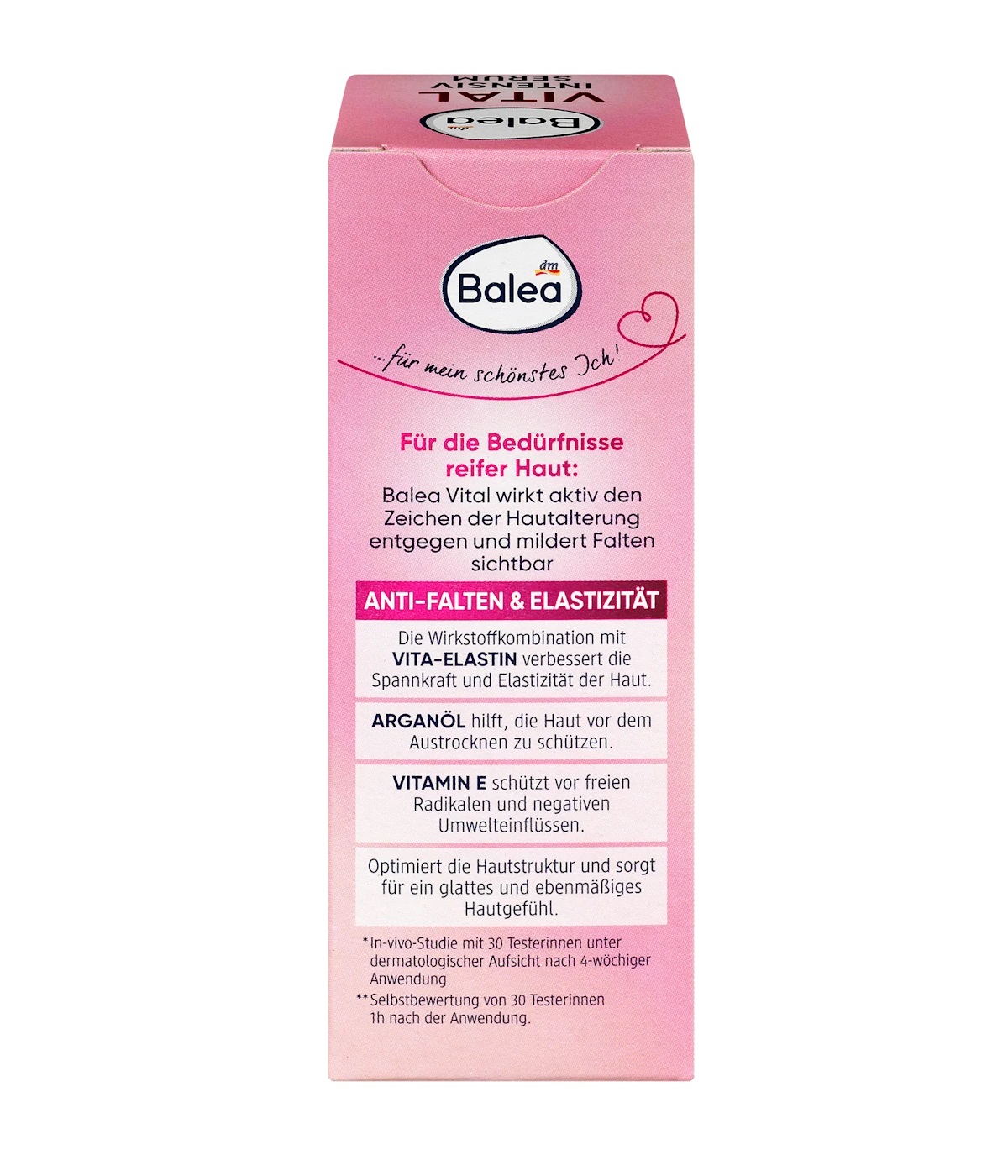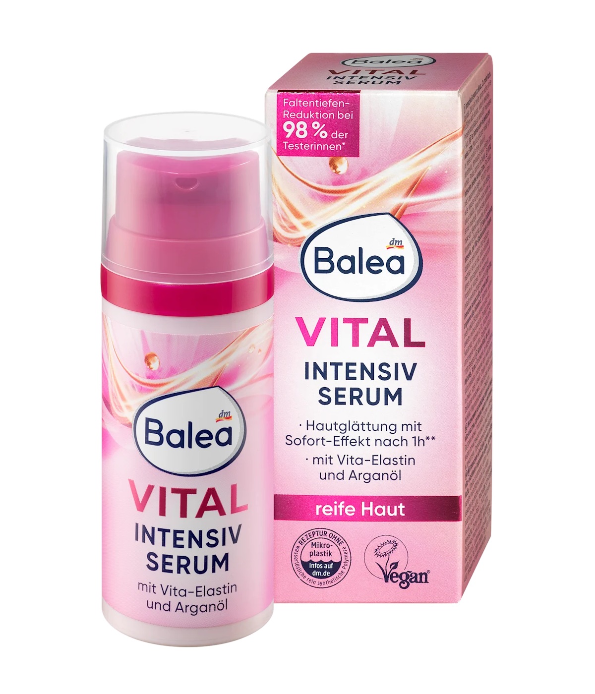 سرم ضد چروک و احیا کننده پوست ویتال باله آ به طور فعال با علائم پیری پوست مقابله میکند و چین و چروکها را ظرف یک ساعت پس از استفاده به طور قابل توجهی کاهش میدهد. در ترکیبات این سرم از روغن آرگان استفاده شده که به محافظت از پوست در برابر خشک شدن کمک میکند.