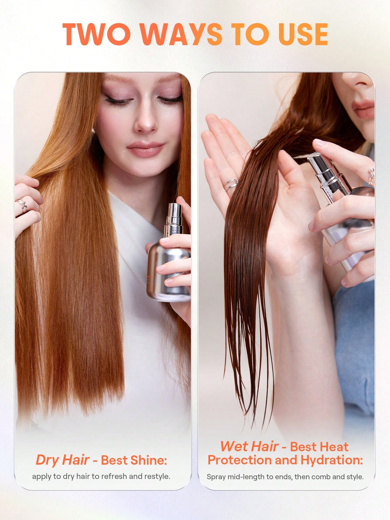 - برای استفاده، کافی است سرم را از فاصله 15 تا 25 سانتیمتری بهطور یکنواخت روی موها اسپری کنید و سپس با یک شانه دندانهپهن موها را شانه کنید تا از شکستگی جلوگیری شود.