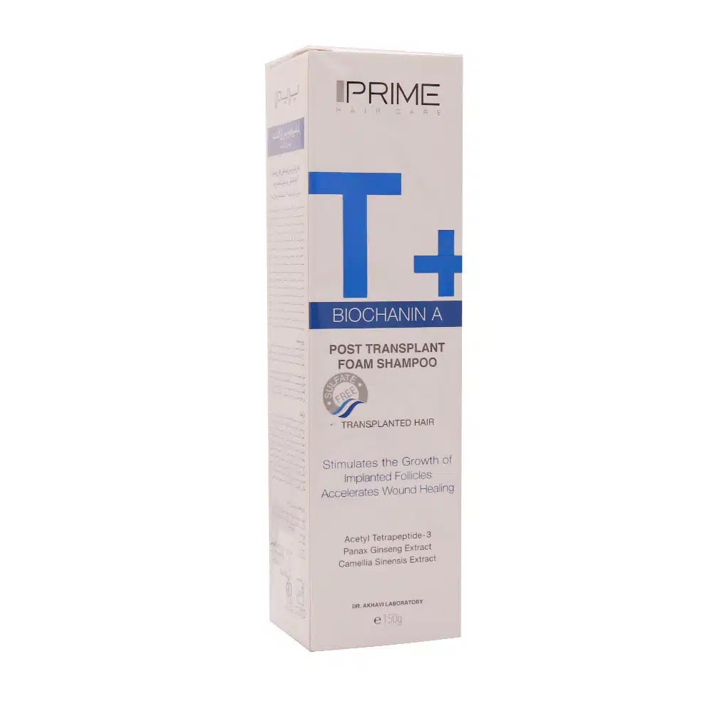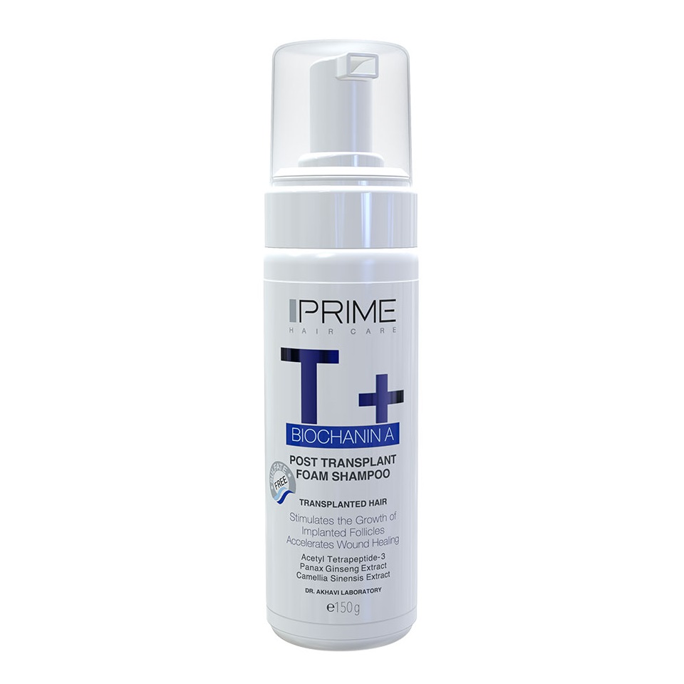 شامپو فوم پس از کاشت مو تی پلاس پرایم (T-Plus Prime) یکی از محصولات تخصصی برند پرایم (Prime) است که برای مراقبت از موهای تازه کاشتهشده طراحی شده است. این محصول به صورت فوم (foam) عرضه میشود که فرمولاسیون ملایمتری نسبت به شامپوهای مایع دارد و برای پوست سر حساس پس از عمل کاشت مو (مانند روشهای FUT، FIT یا PRP) ایدهآل است. این شامپو با تمرکز بر تقویت فولیکولهای مو، کاهش التهاب و جلوگیری از عفونت، به تسریع روند بهبودی کمک میکند. حجم استاندارد آن ۱۵۰ گرم است و تولیدکننده آن شرکت ایرانی لابراتوارهای معتبر (مانند دکتر اخوی) است.
