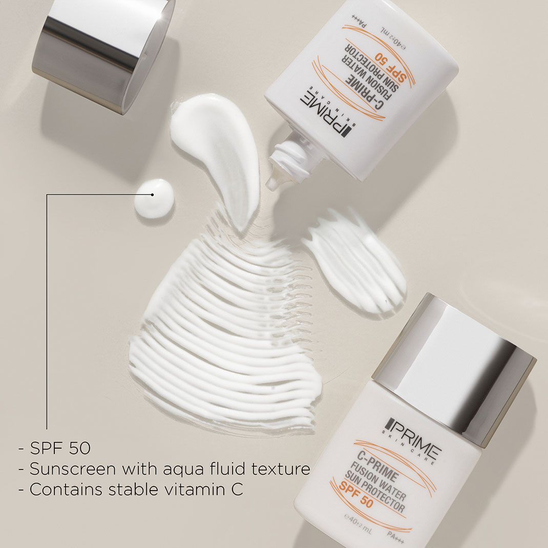 ضد آفتاب فیوژن واتر پرایم (Prime Fusion Water Sunscreen SPF50) یکی از محصولات محبوب برند ایرانی پرایم (از لابراتوار دکتر اخوی) است که در سال ۱۳۹۶ معرفی شده و بخشی از خط تولید C-Prime (تمرکز بر ویتامین C) به شمار میرود. این محصول به صورت فلوئید (مایع سبک) عرضه میشود و حجم استاندارد آن ۴۰ میلیلیتر است. بر پایه آب طراحی شده و بافت فوقالعاده سبکی دارد که شبیه به محصولات خارجی مانند فیوژن واتر ایزدین عمل میکند.
