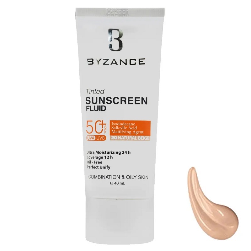 در ترکیبات ضد آفتاب رنگی بیزانس SPF50 پوست چرب از سالیسیلیک اسید استفاده شده است که می تواند با حذف لایه های مرده پوست صورت در کاهش آکنه و پاکسازی منافذ باز موثر واقع شود. علاوه بر این، رطوبترسانی طولانی مدت و قدرت ماندگاری ۱۲ ساعته ضد آفتاب فلوئید بیزانس با ایجاد پوششی مات و یکنواخت روی پوست، آن را به گزینه ای ایده آل برای مراقبت از پوست در برابر عوامل محیطی تبدیل میکند.