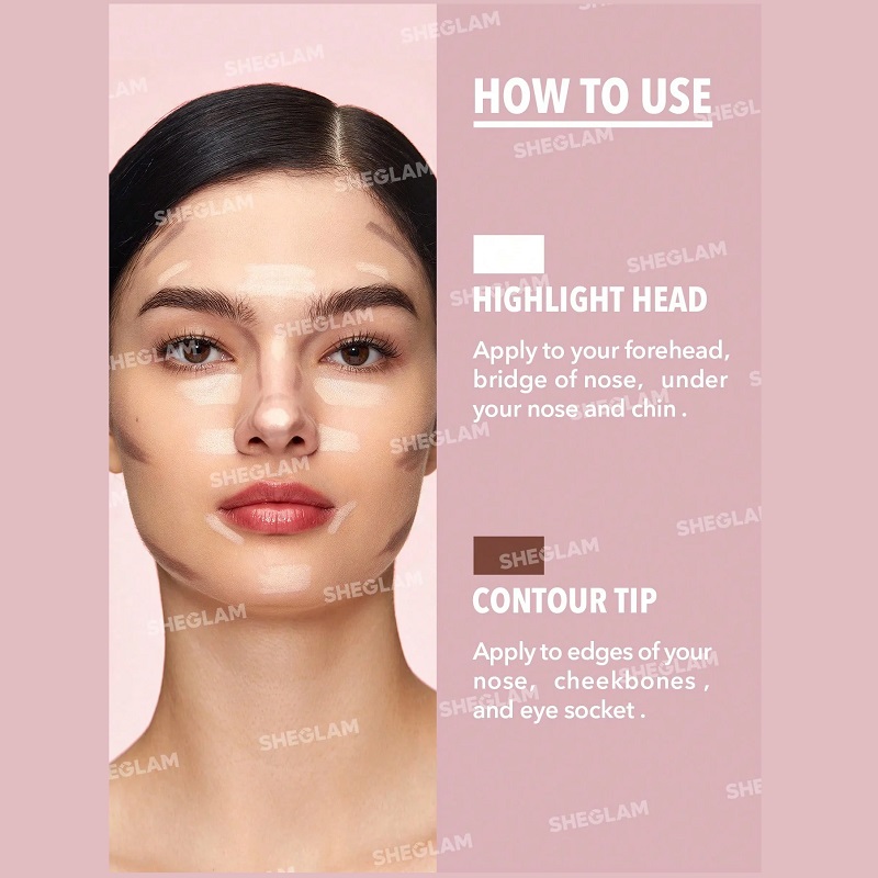 با استفاده از قلم هایلایتر و کانتور 2 در 1 شیگلم به سرعت می توانید آرایشی زیبا و خاص برای خود ایجاد نمایید. با سر کانتور آن در گوشه های بینی و یا زیر گونه سطحی یکنواخت ایجاد نموده و از سر هایلایتر آن در نوک بینی و یا بالای گونه استفاده نموده تا بینی کوچک تر و گونه ها حجم دار تر نشان داده شوند.