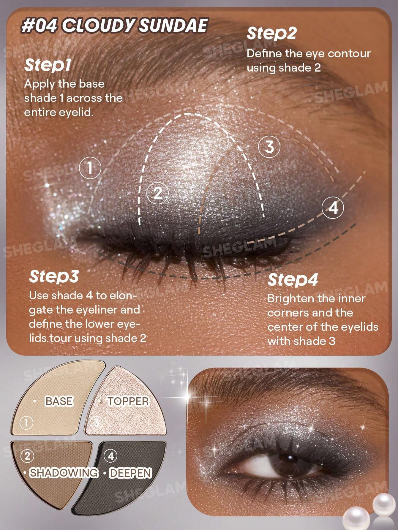 - این پالت شامل چهار رنگ است: سه سایه مات (مات کامل و نیمهمات) و یک سایه براق با جلوه شیمری (wet-look shimmer).