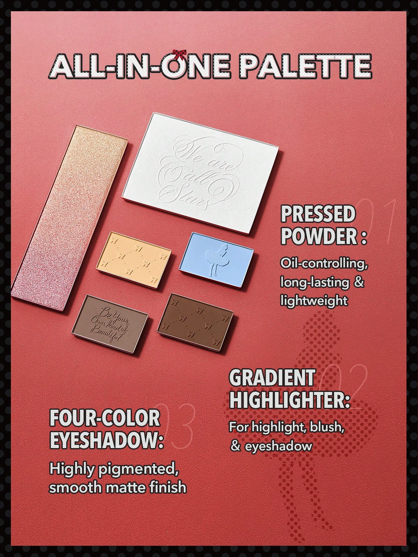 در این پالت زیبا و کاربردی یک پودر کنترل کننده چربی و فیکس کننده آرایش، یک رژگونه براق و 4 رنگ سایه بسیار کاربردی قرار داده شده است که نشاز شما را کاملا برطرف می نماید.
