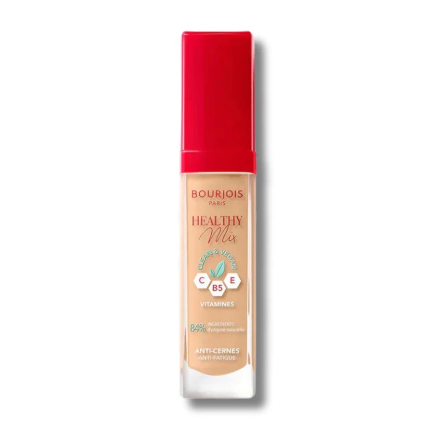 کانسیلر هلتی میکس بورژوا با پوشش دهی عالی و عملکرد ویژه ی خود نقش مهمی در از بین بردن علائم خستگی چشم تان بر عهده دارد و استفاده از آن تیرگی و پف زیر چشم را کاهش میدهد. کانسیلر هلثی میکس بورژوا با بافت سبک و آبرسانی عالی سبب تنفس بهتر بافت پوست شده و همچنین با متعادل کردن رنگ پوست به افزایش شفافیت و رفع نواحی تیره دور چشم نیز کمک فراوانی می کند. این محصول فوق العاده از ویتامین های مورد نیاز پوست تهیه شده که با خاصیت منحصر به فردی که دارد پوشش کاملا طبیعی روی پوست ایجاد می کند و با نرم و لطیف کردن پوست جلوه ی خاصی به چهره ی شما می بخشد. سعی کنید رنگ کانسیلری که انتخاب می کنید یک یا دو درجه از رنگ کرم پودر تان روشن تر باشد زیرا این امر موجب شده تا چهره ی شما ظاهری کاملا طبیعی پیدا کند. از دیگر ویژگیهای مثبت این کانسیلر، وجود ویتامین E می باشد که موجب مرطوب کنندگی و آبرسانی پوست می شود.