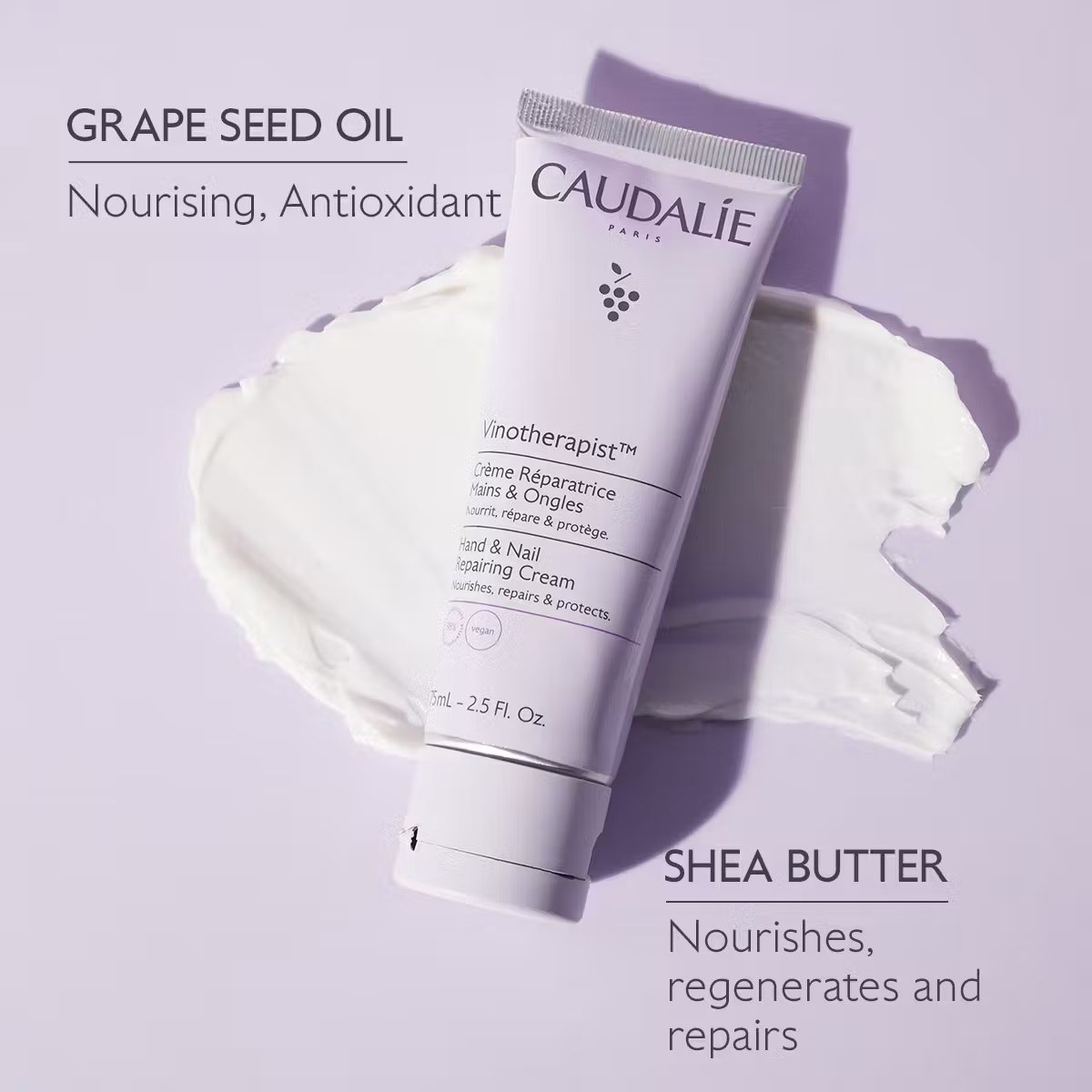 کرم ترمیمکننده دست و ناخن وینوتراپیست کدلی (Caudalie Vinotherapist Hand & Nail Repairing Cream) محصولی مغذی و ترمیمکننده برای پوست خشک دستها و تقویت ناخنها و کوتیکولها است. این کرم با فرمولاسیونی غنی و بدون ایجاد حس چربی، پوست دست را نرم، لطیف و محافظتشده نگه میدارد و از دهیدراته شدن آن در برابر عوامل خارجی مانند سرما، باد و مواد شیمیایی جلوگیری میکند.